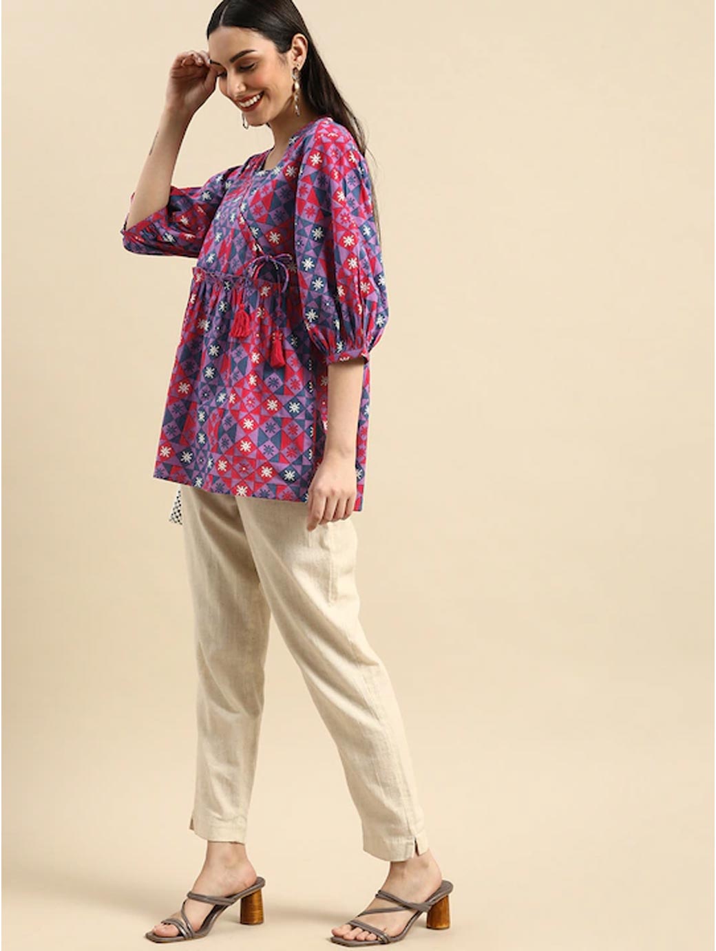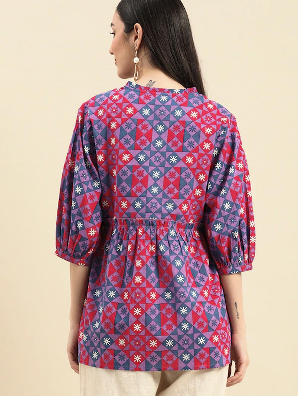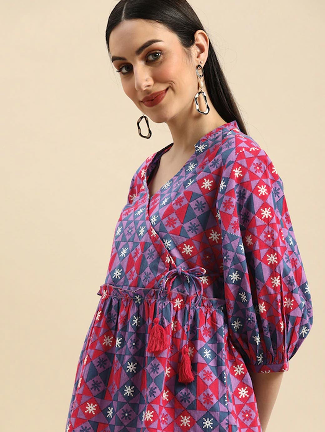 Purple and pink regular wrap top Geometric print V-neck, three-quarter, puff sleeve sleeves Gathered or pleated detail Woven.