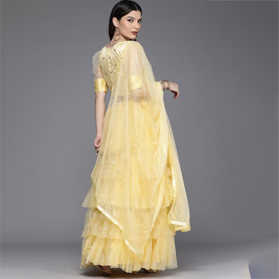 Beige woven design unstitched blouse, has a round neck, short sleeves, beige woven design semi-stitched lehenga, has drawstring closure, flared hem