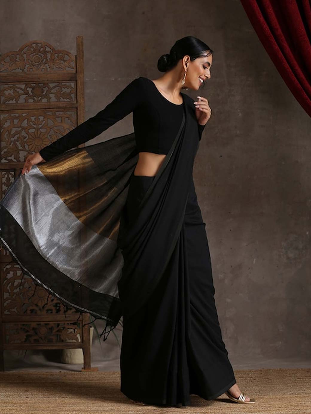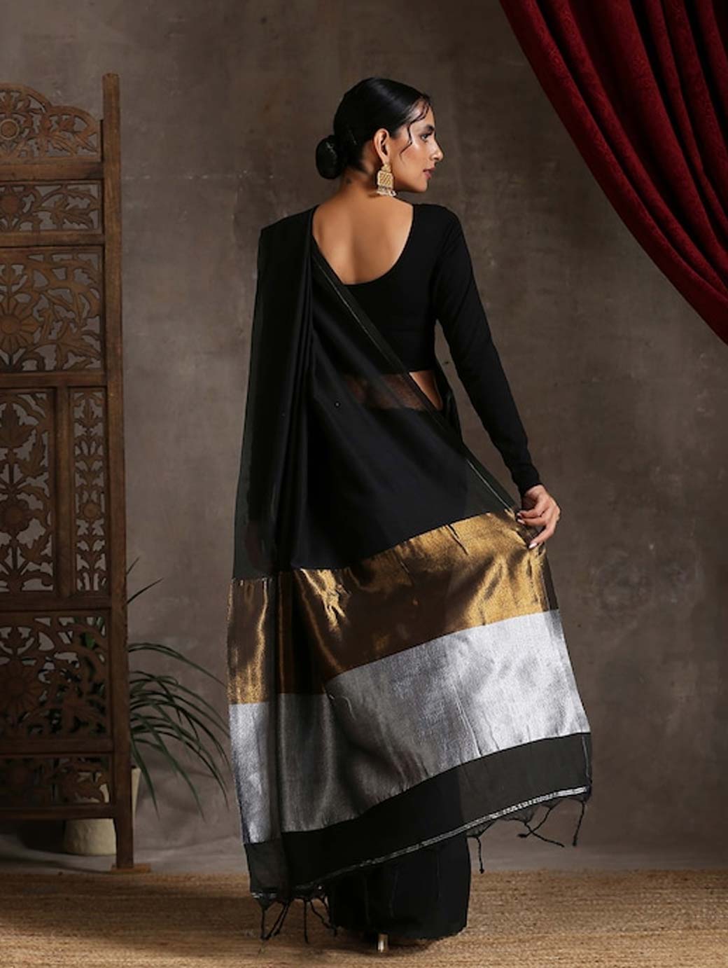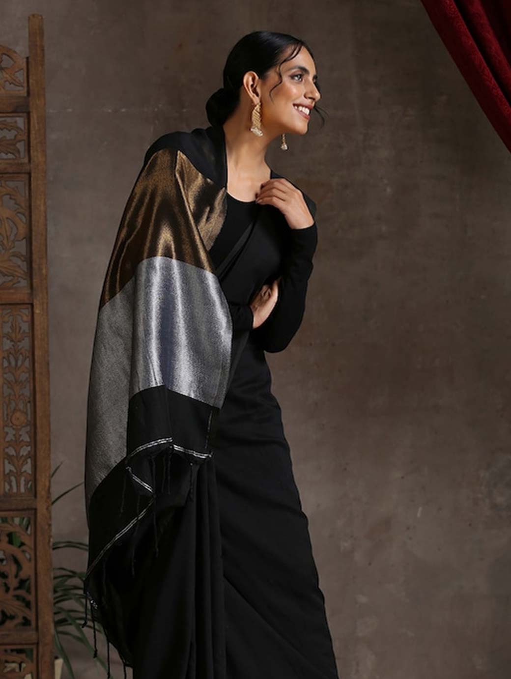 Black and gold-toned saree Solid saree with solid border
