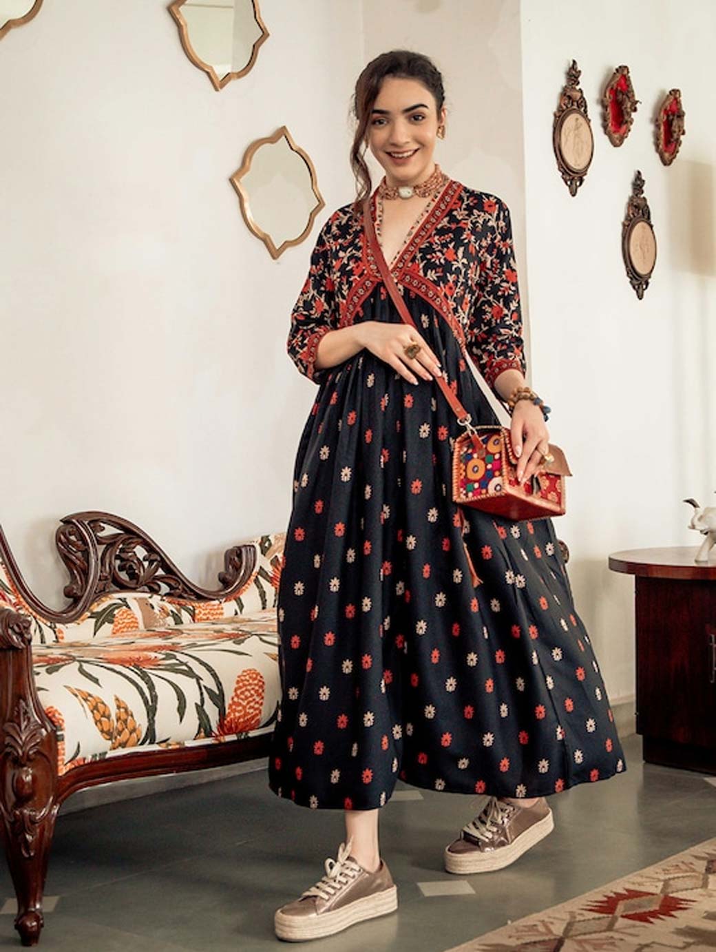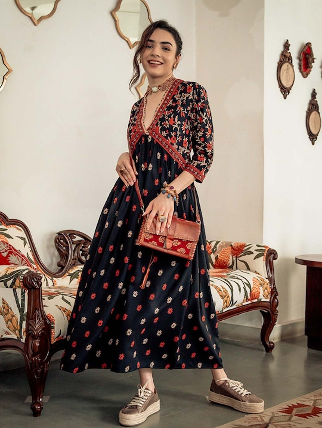 Black and Orange printed woven maxi dress, has a V-neck, three-quarter sleeves, and flared hem