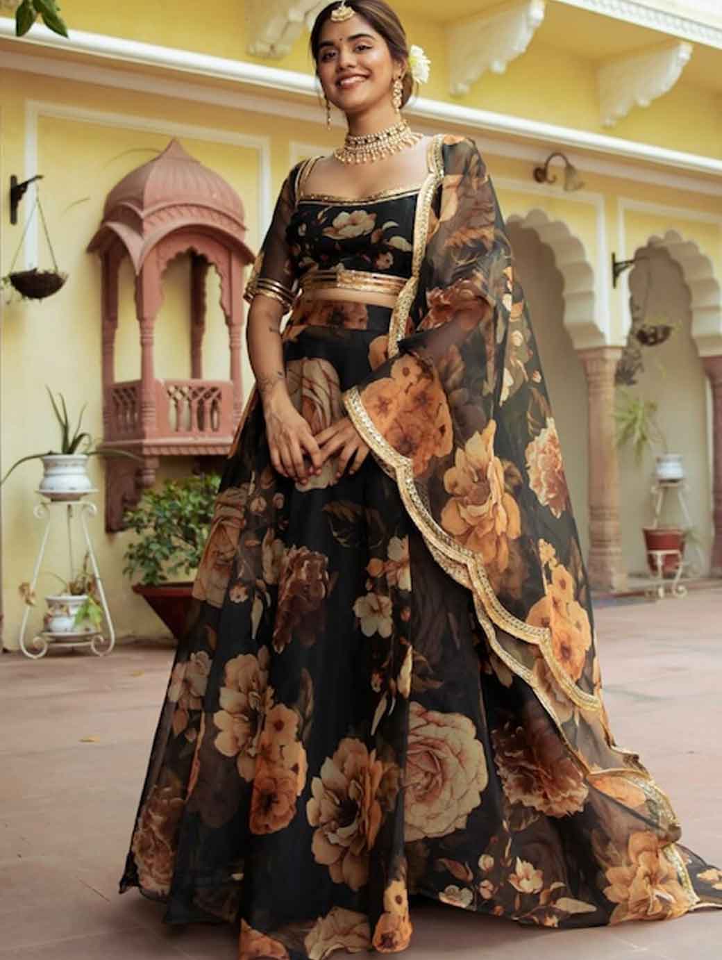 Green and brown printed lehenga choli with dupatta,