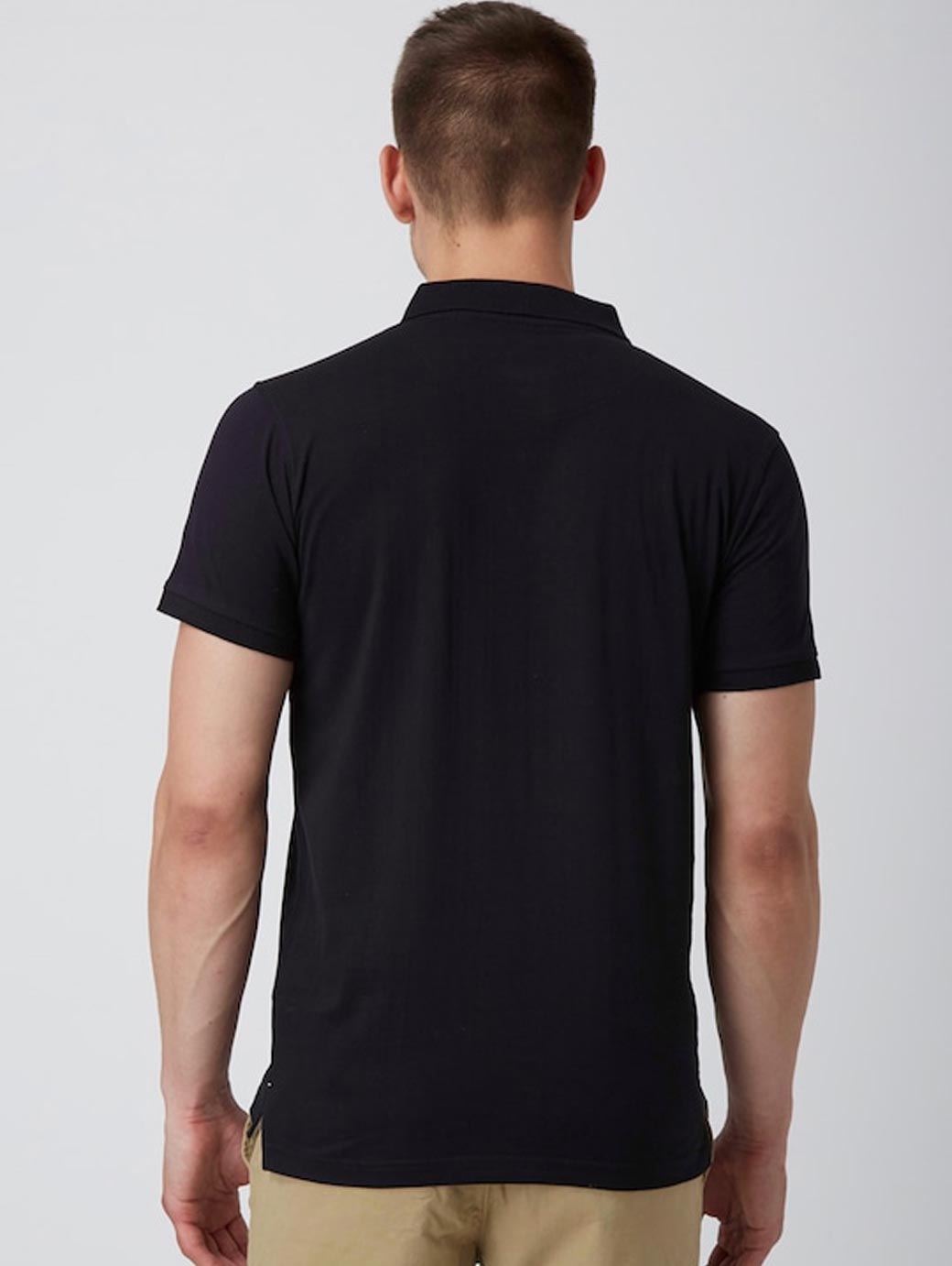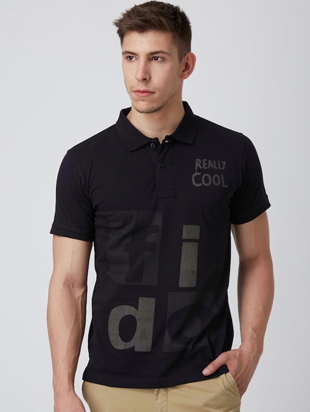 Black printed T-shirt, has a polo collar, short sleeves.