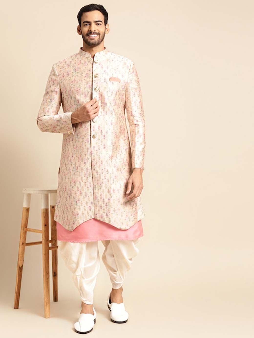 Men Cream-coloured & Pink Woven Design Sherwani Set