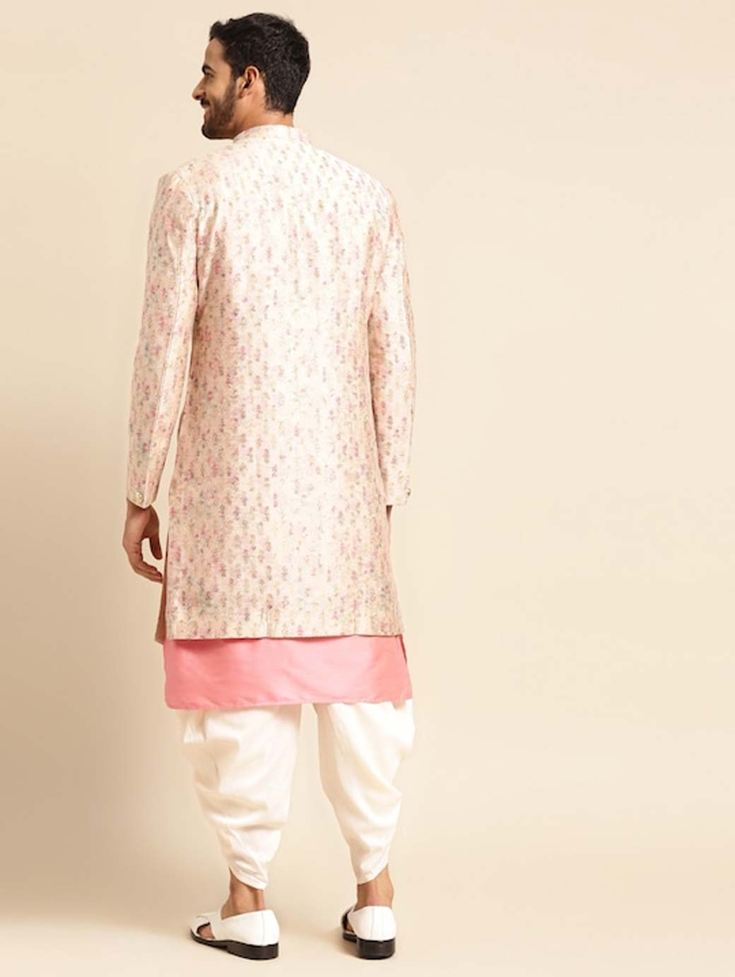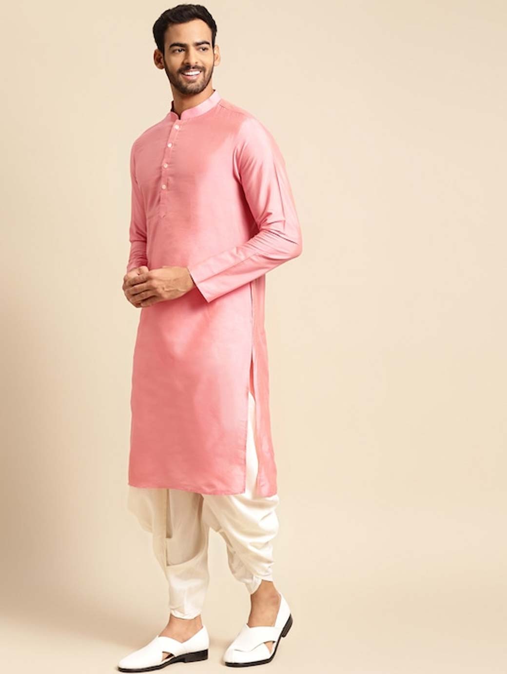 Cream-coloured woven design kurta, has mandarin collar and long sleeves Pink solid kurta, has a mandarin collar and long sleeves Off-white solid dhoti, has an elasticated waistband with drawstring closure