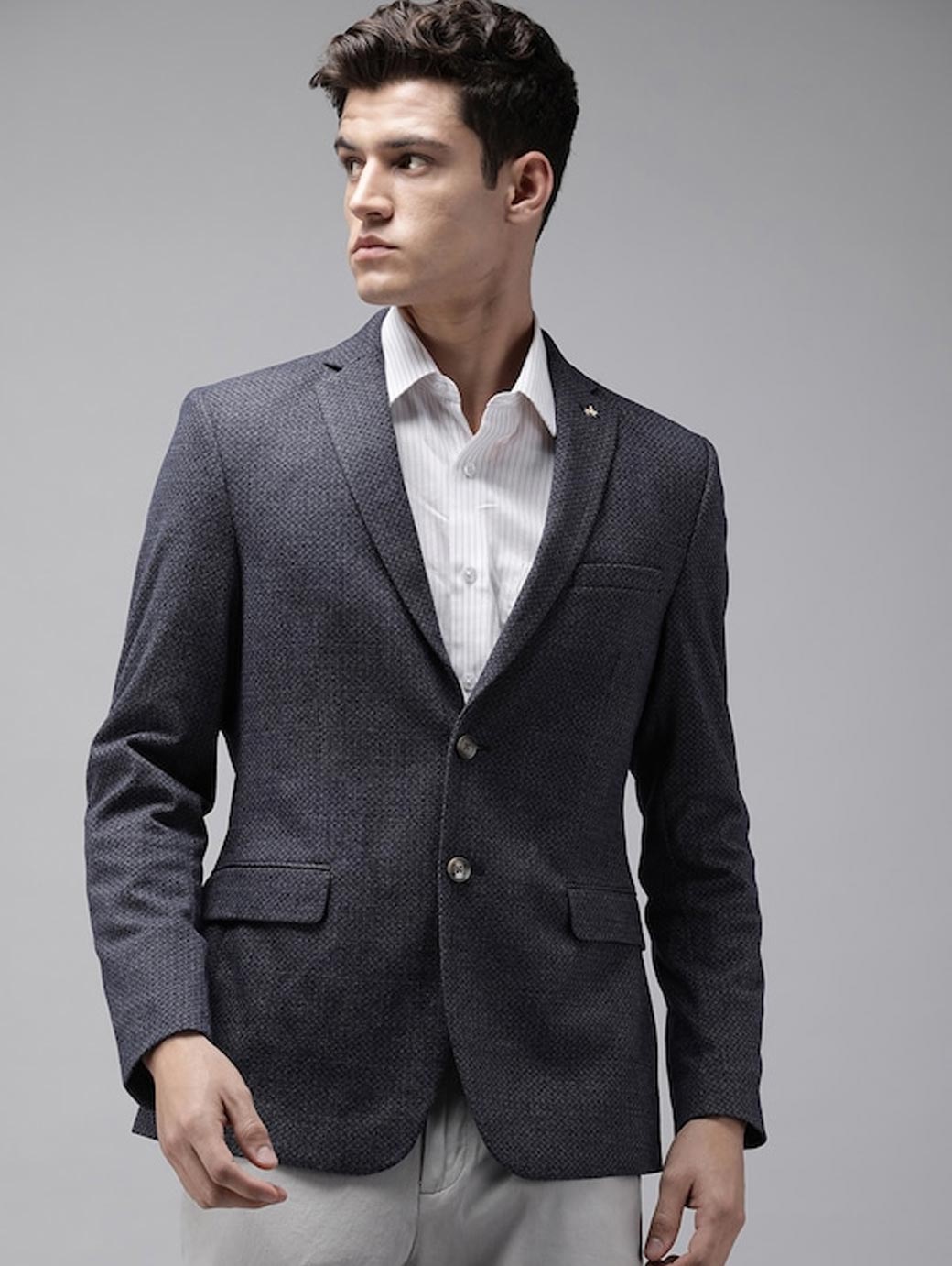 Men Navy Blue Self Design Slim Fit Single-Breasted Smart Casual Blazer