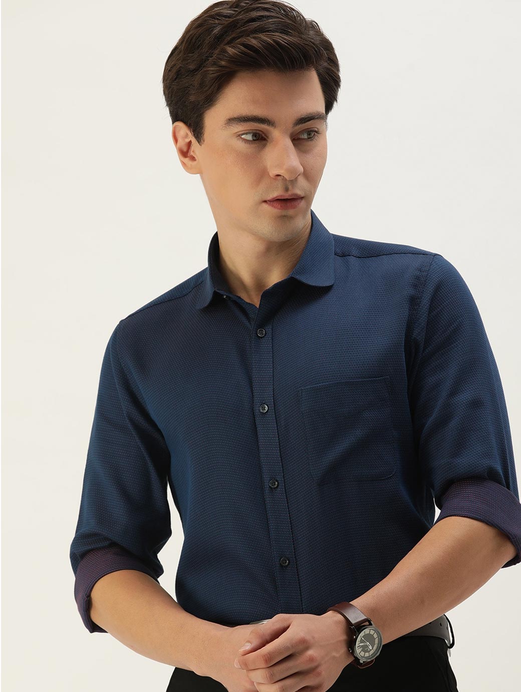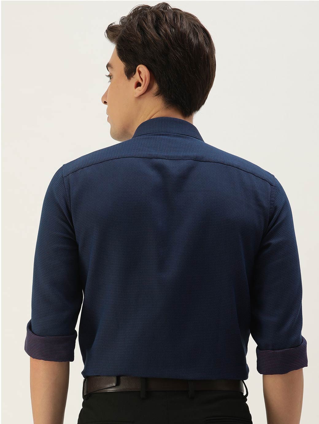 Navy blue textured self design opaque Formal shirt ,has a spread collar, button placket, 1 patch pocket, long regular sleeves, curved hem