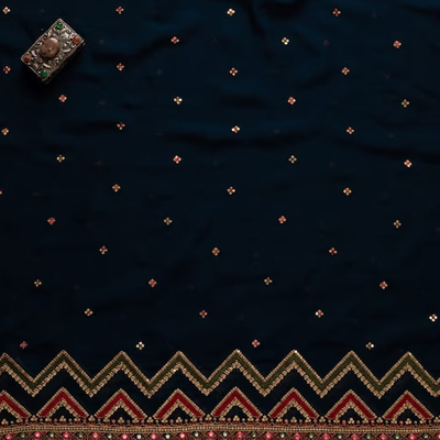 Navy blue and pink embroidered unstitched dress material Navy blue and pink embroidered kurta fabric Navy blue and pink solid bottom fabric Navy blue and pink dupatta, has taping border Disclaimer: Images are for referral purposes only. The actual product is unstitched