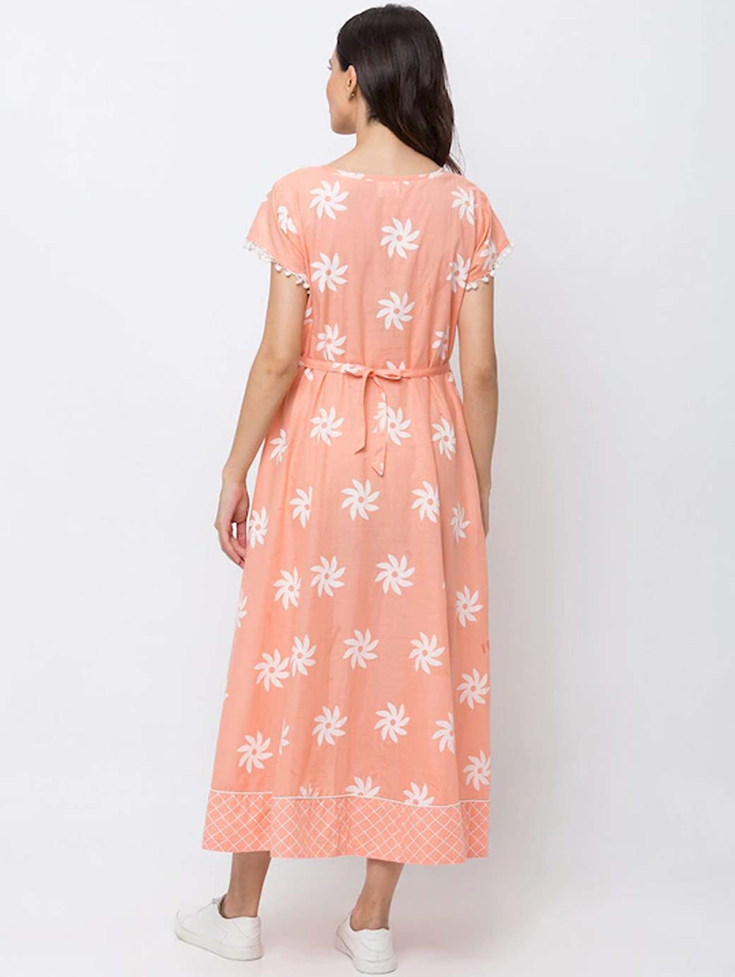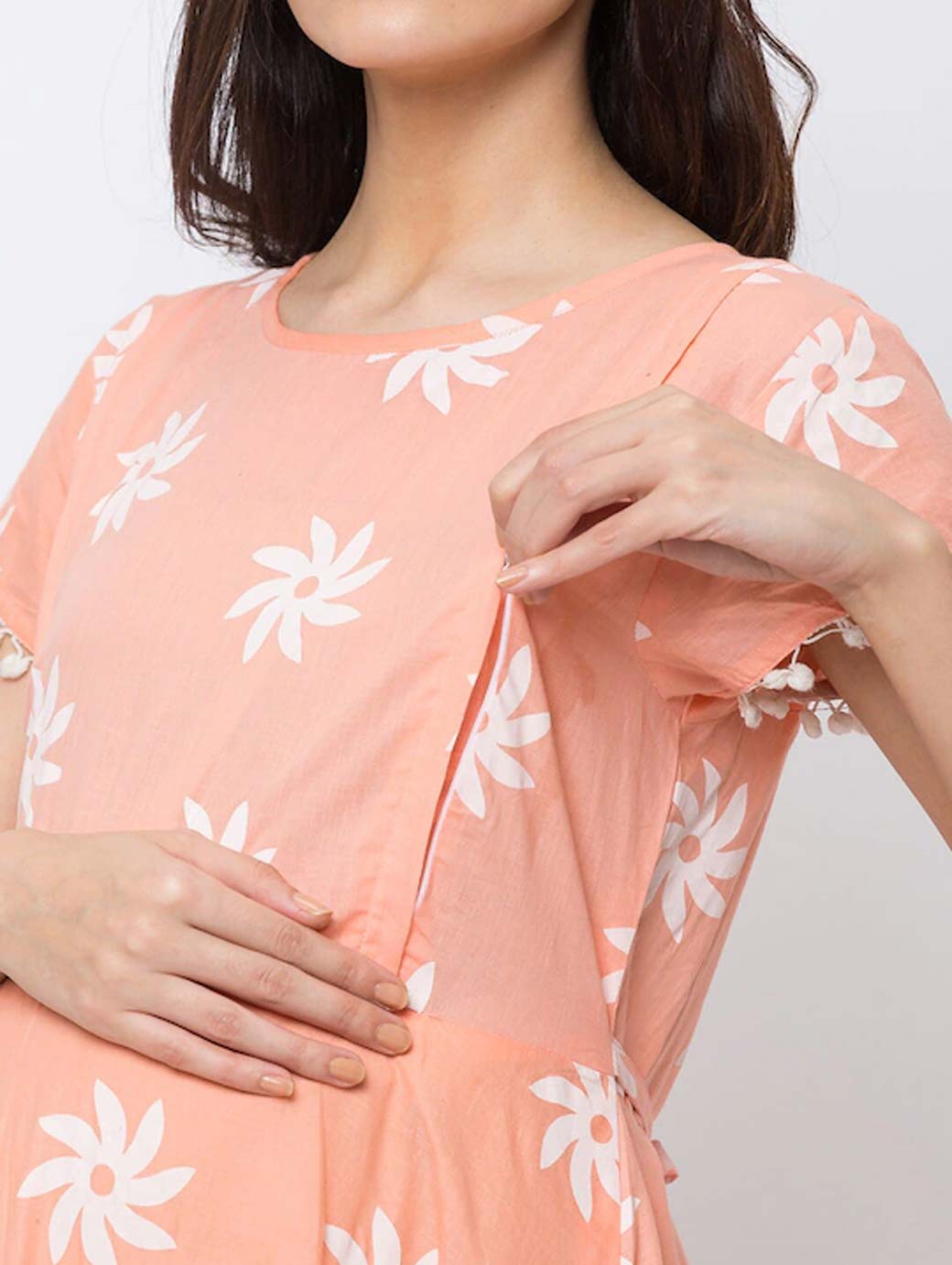 Peach-Coloured Printed Fit and Flare Maternity Feeding Nursing Dress