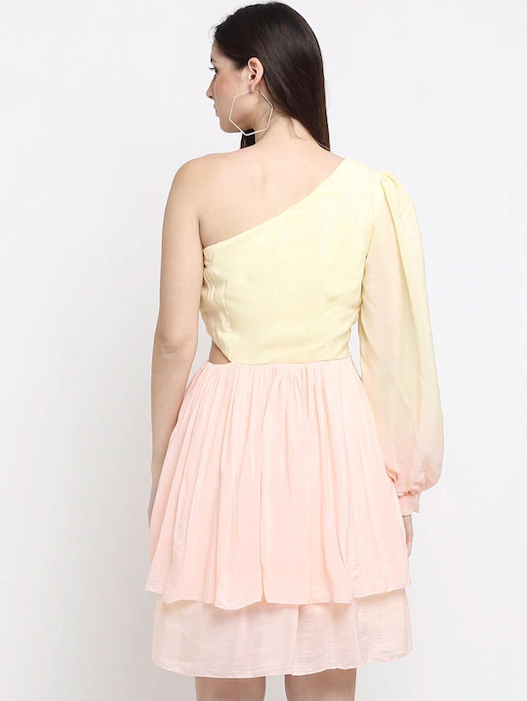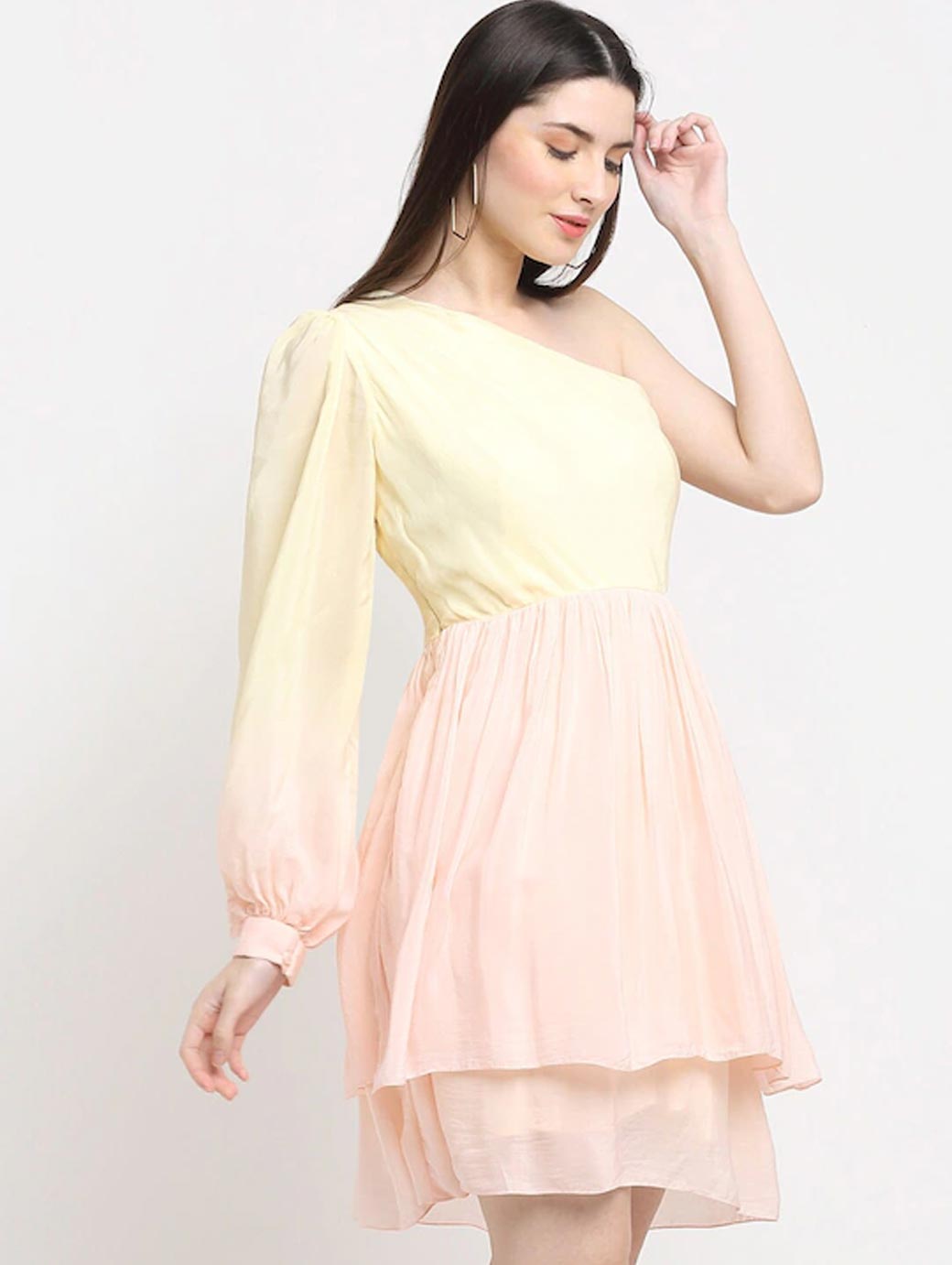 Pink and yellow solid fit & flare dress, One shoulder, Long, puff sleeve, Gathered or pleated detail, Above knee length in flared hem, Crepe fabric, Concealed zip closure.