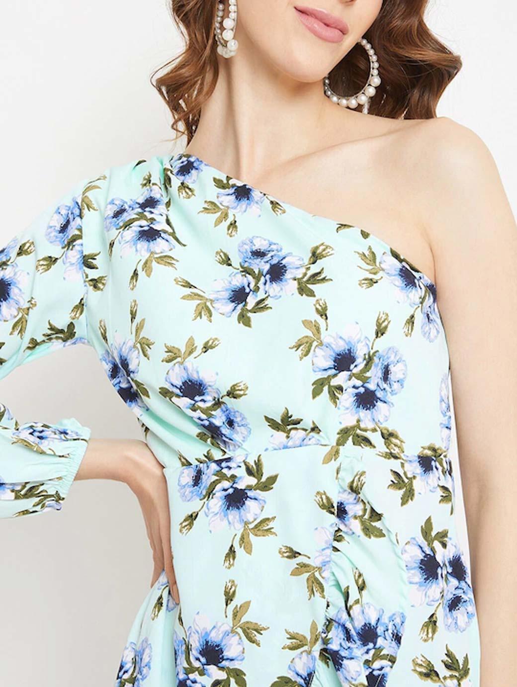 Green floral print wrap dress, One shoulder, Three-quarter, puff sleeve, Mini length in tulip hem, Crepe fabric, Concealed zip closure.
