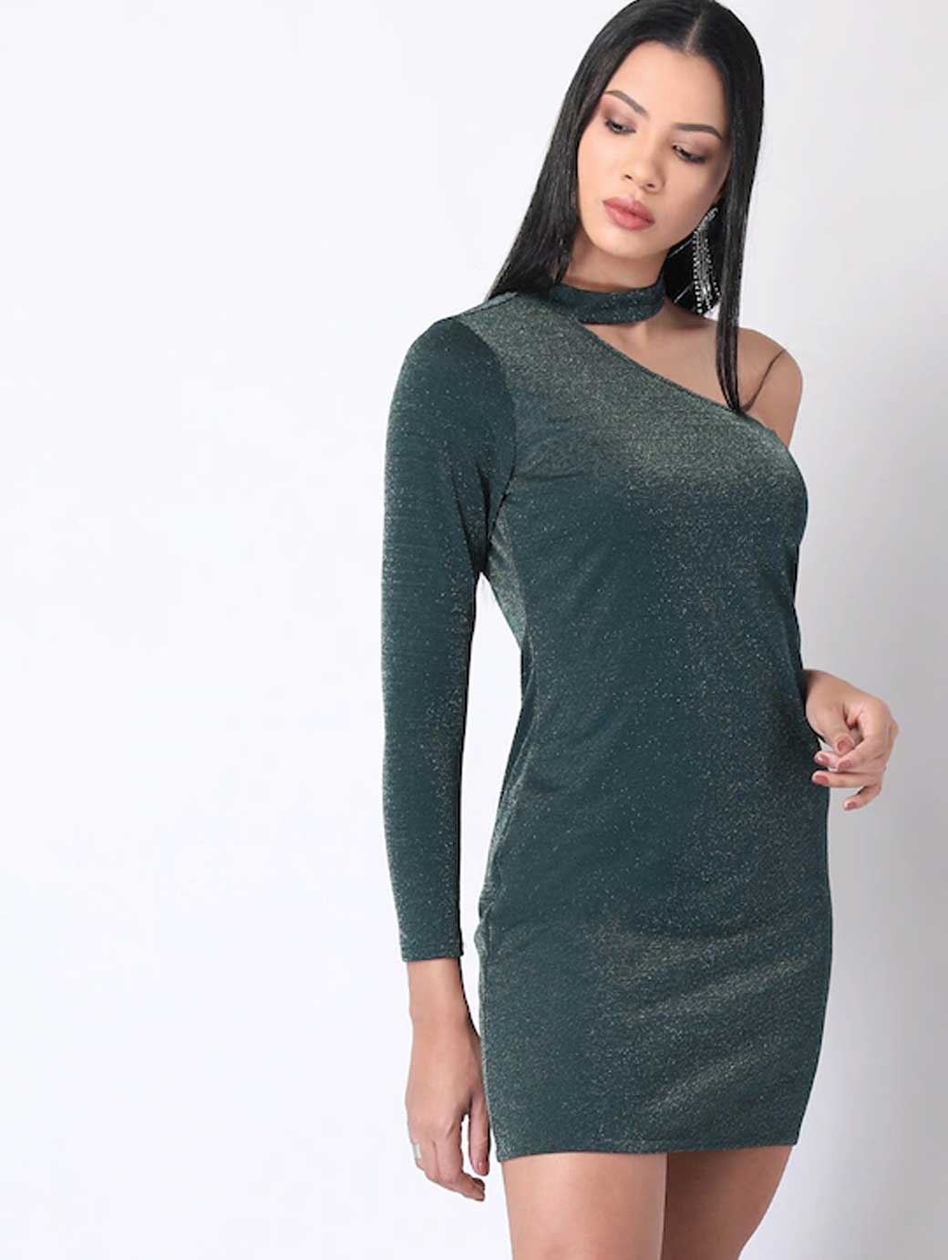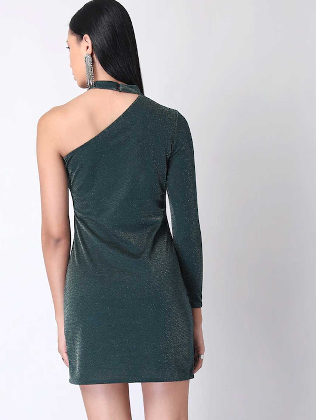 Green solid bodycon dress, One shoulder, Long, regular sleeves, Sheen detail, Mini length in straight hem. Button closure.