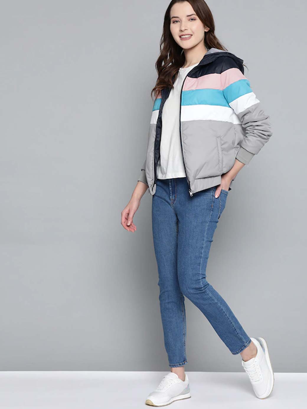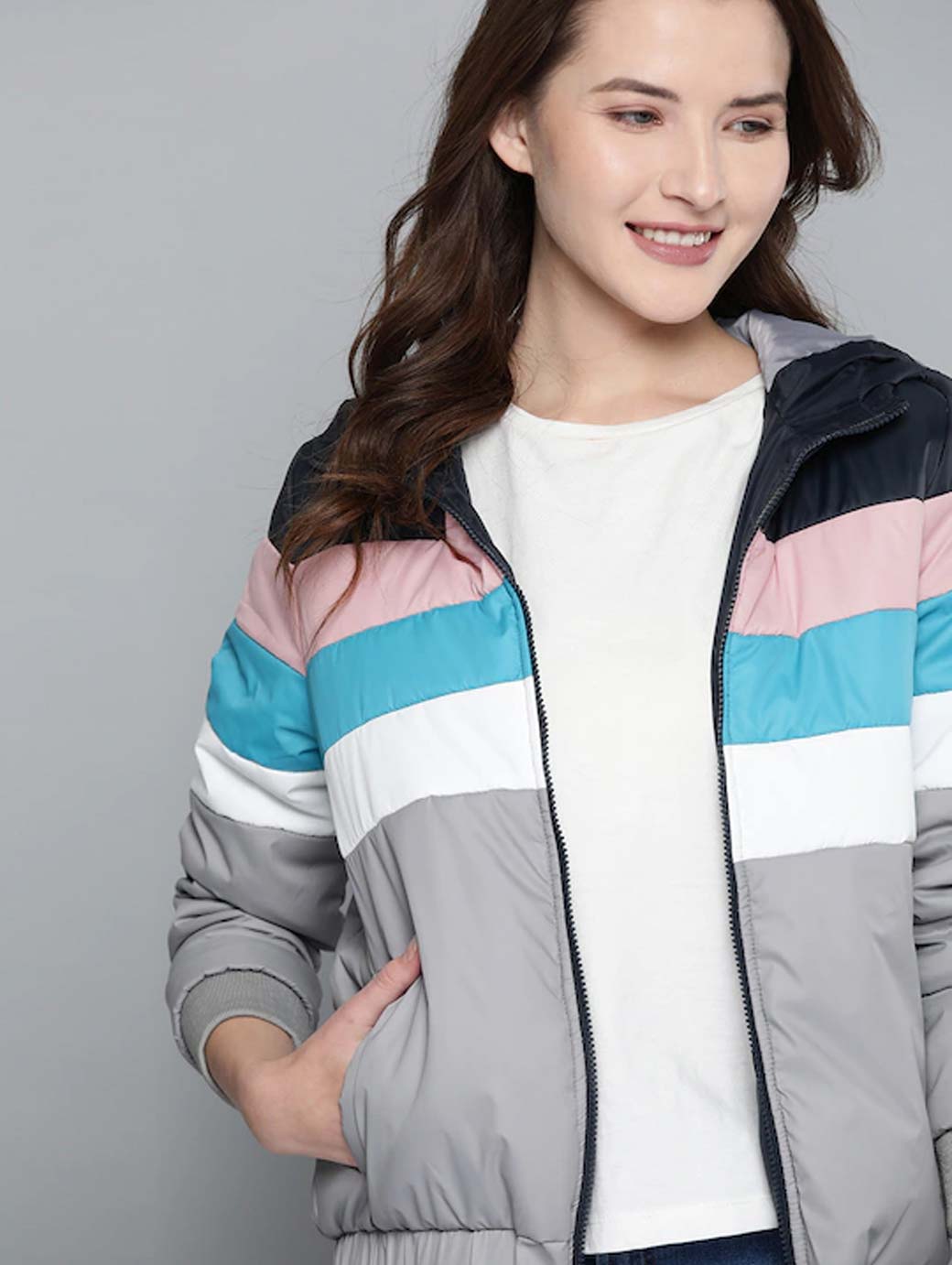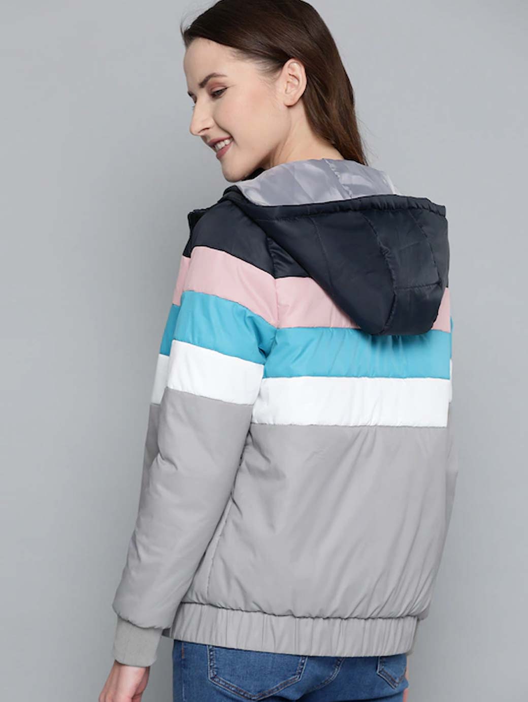 Grey and Navy Blue striped bomber jacket, has a hooded, 2 pockets, zip closure, long sleeves, straight hem, and polyester lining