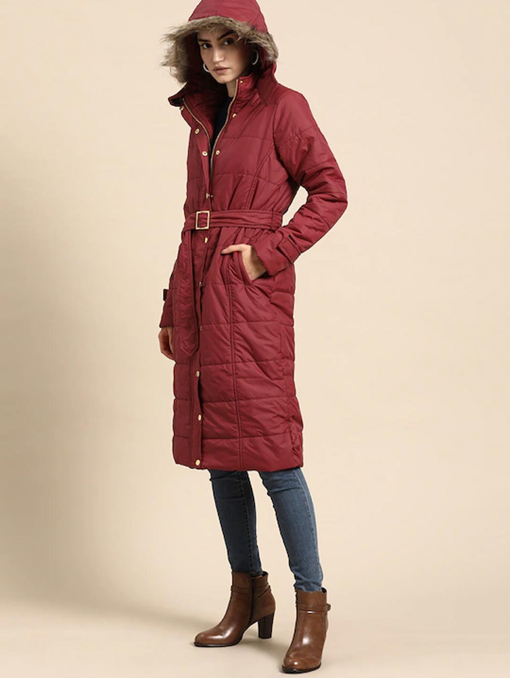 Maroon solid longline parka jacket with faux fur trim, has a detachable hood, 3 pockets ,has a snap button and zip closure, long sleeves, straight hemline, polyester lining Comes with a belt