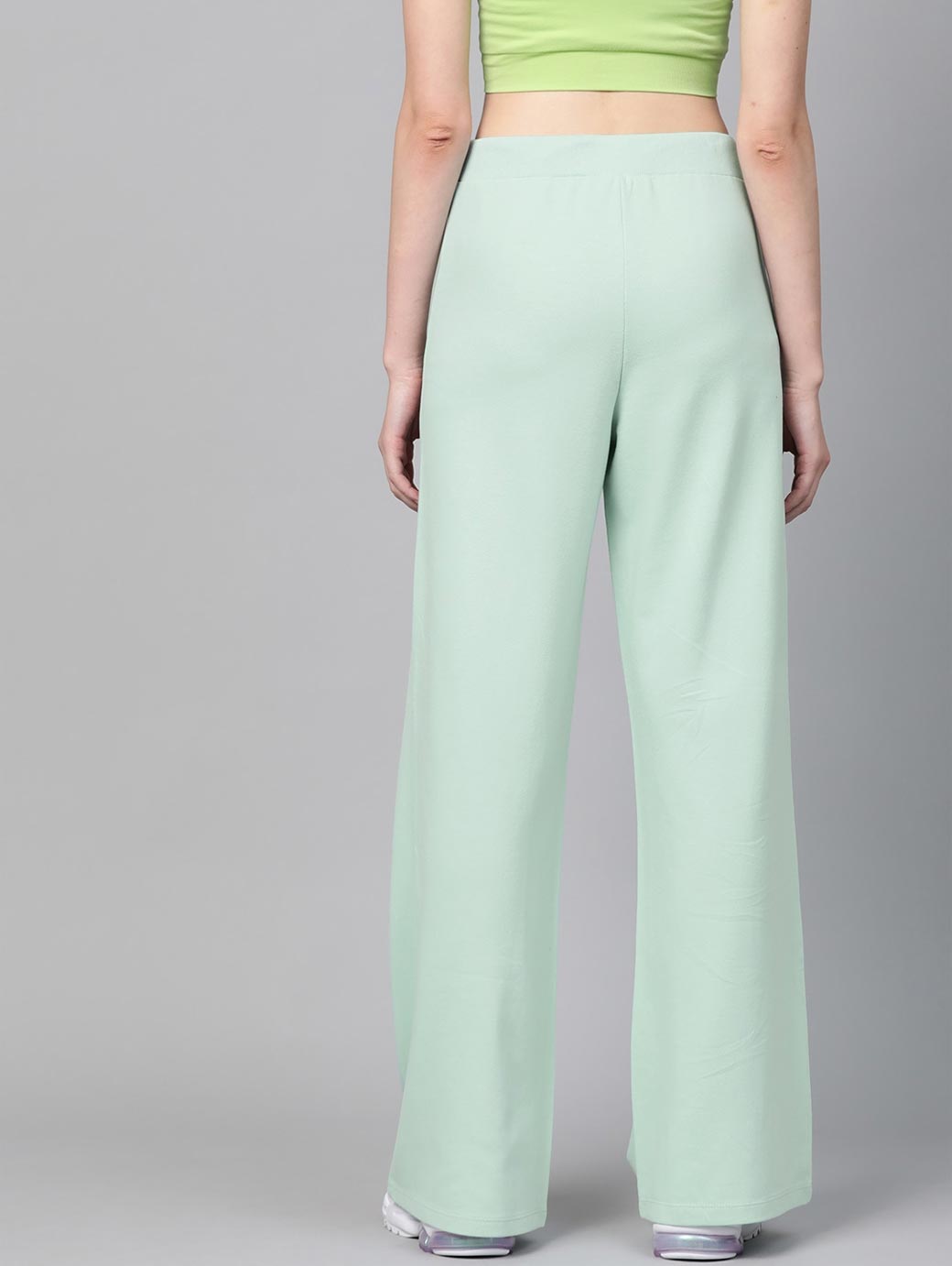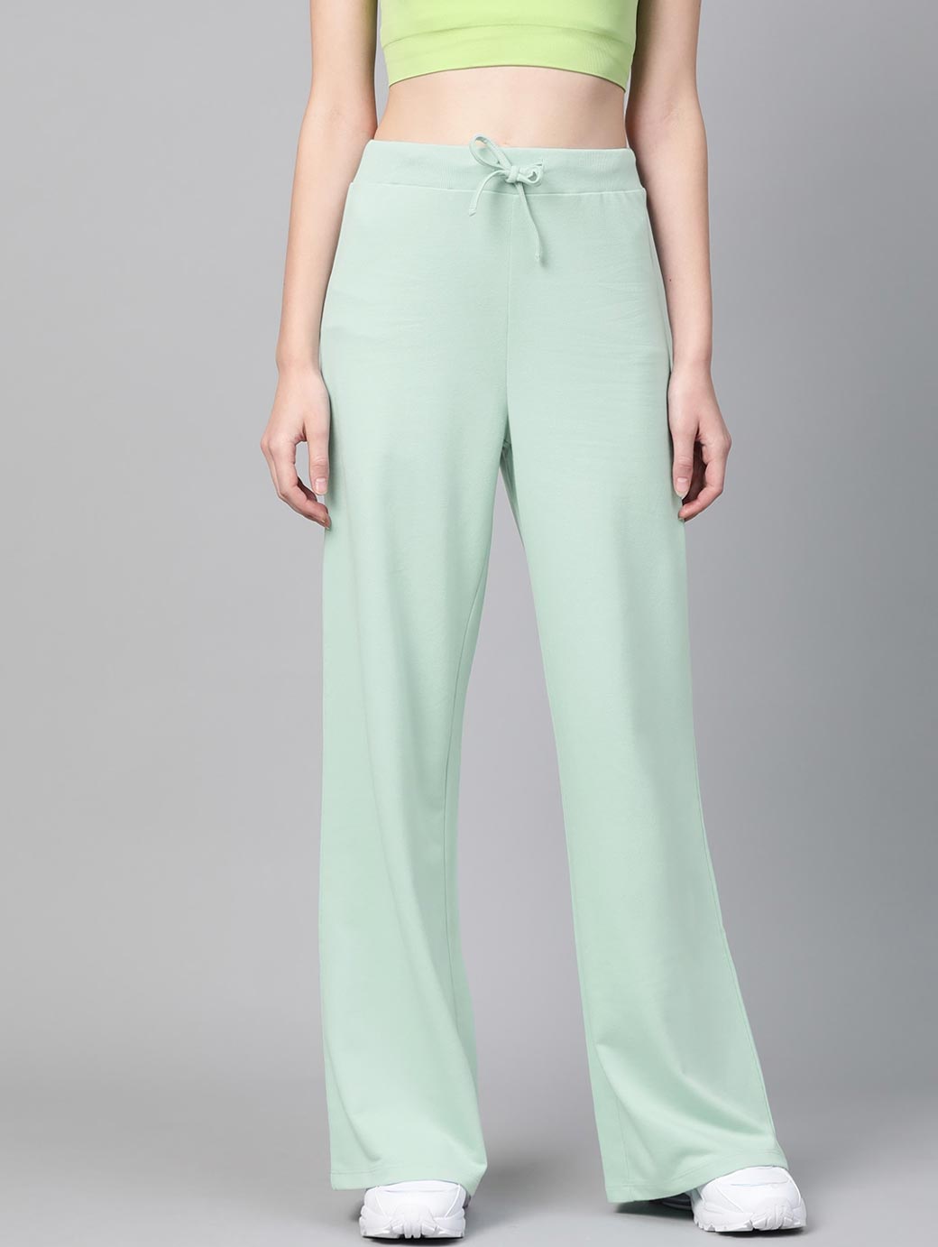 A pair of mint green solid wide leg track pants, has an elasticated waistband with outer drawstring closure