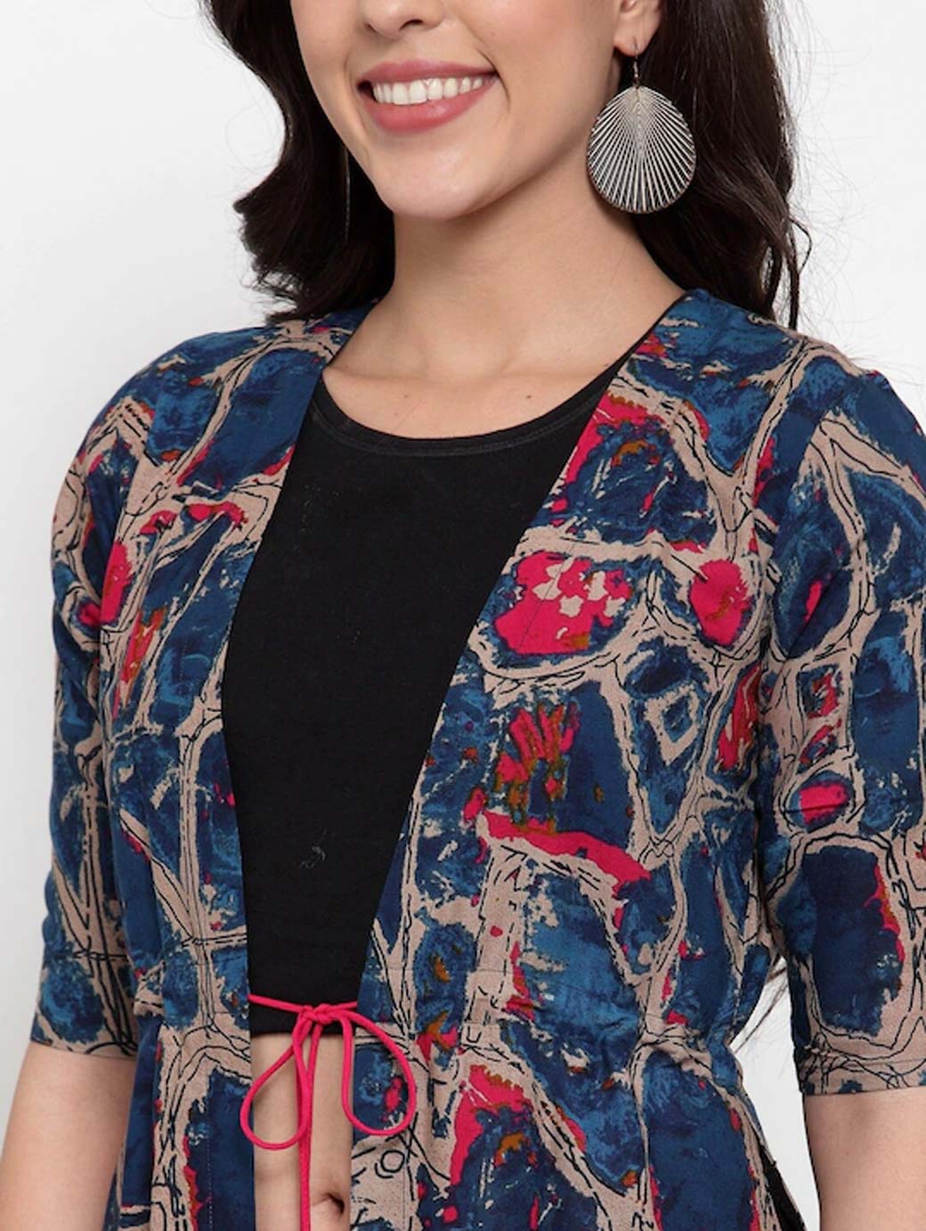 Multicoloured printed open front regular shrug, has three-quarter sleeves, tasselled detail, straight hem