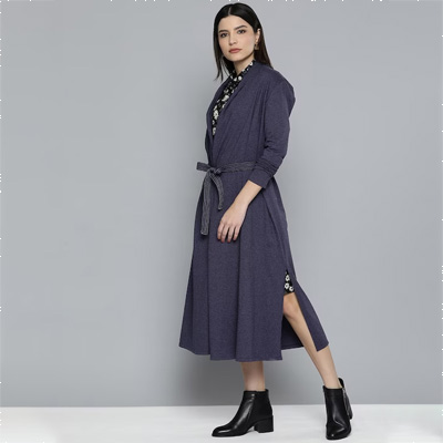 Women Navy Blue Longline Solid Full Length Cover Up Tie-Up Shrug