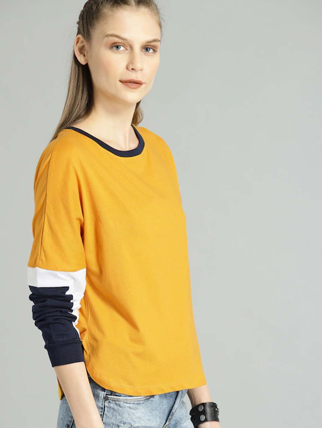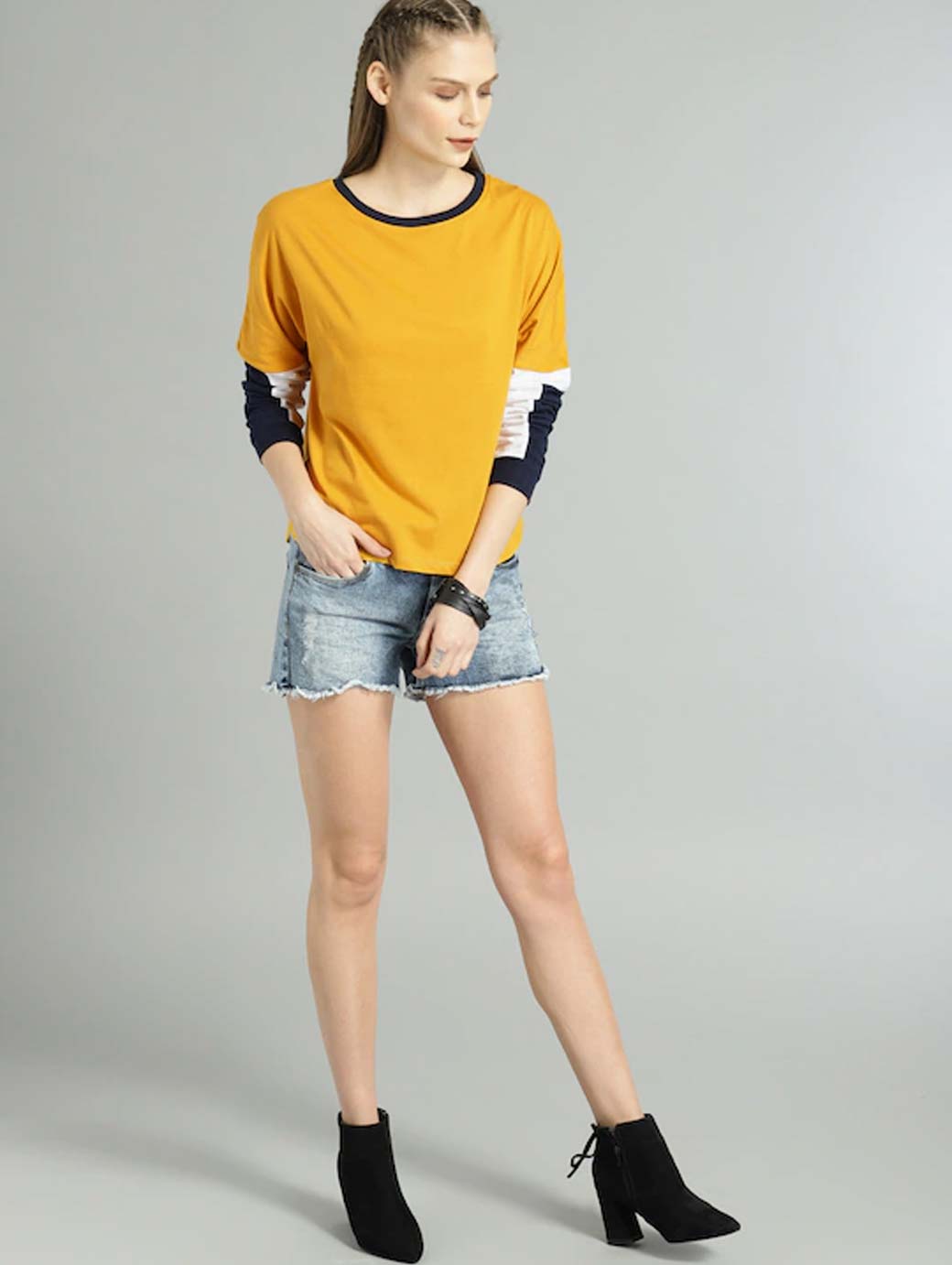Women Yellow Solid Round Neck Knitted Pure Cotton T-shirt